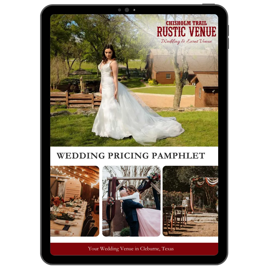This pricing pamphlet will give you a taste of the Chisholm Trail Rustic Venue wedding experience while in the comfort of your own home! Packed with pricing, packages, amenities, and much more!